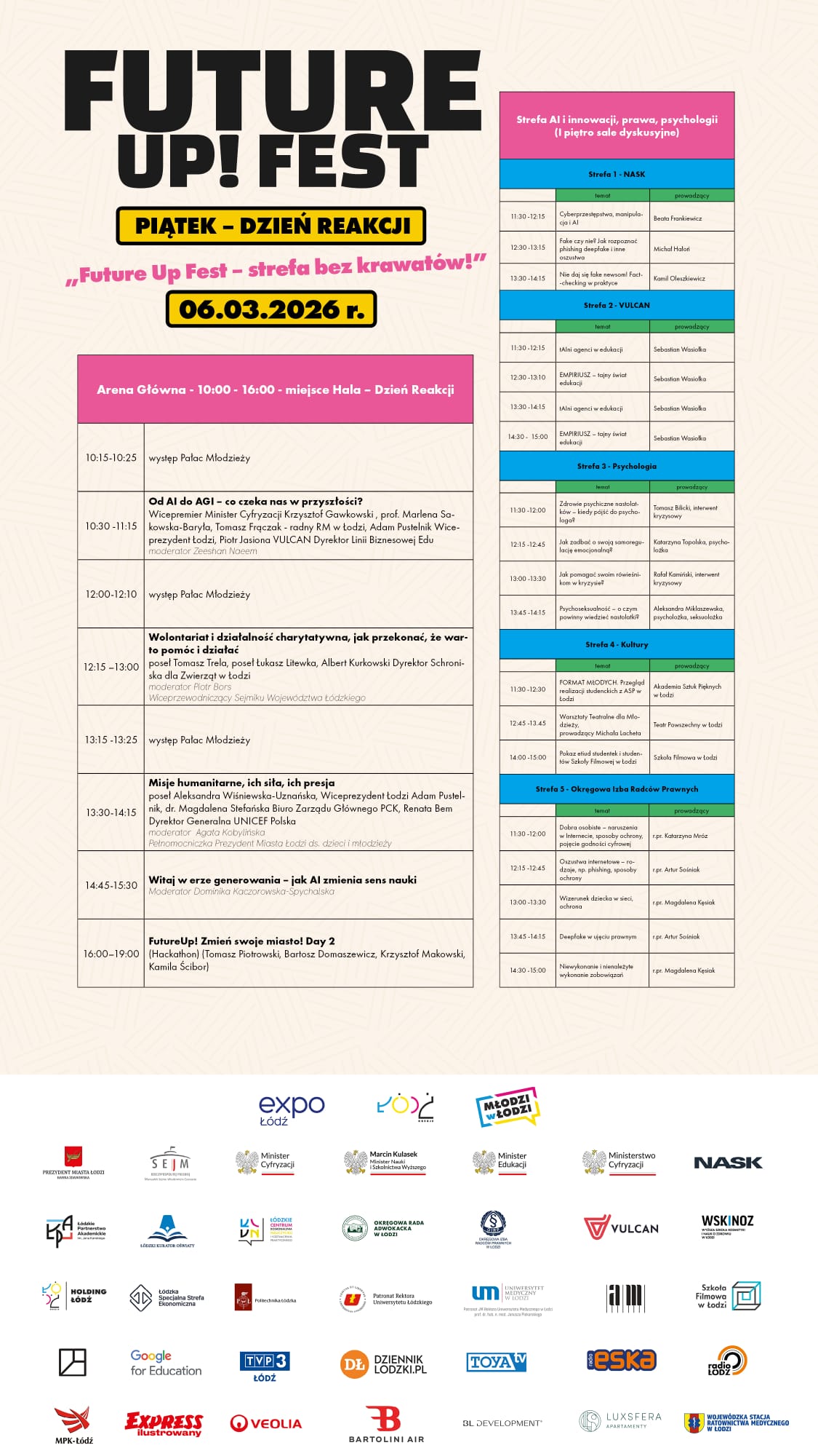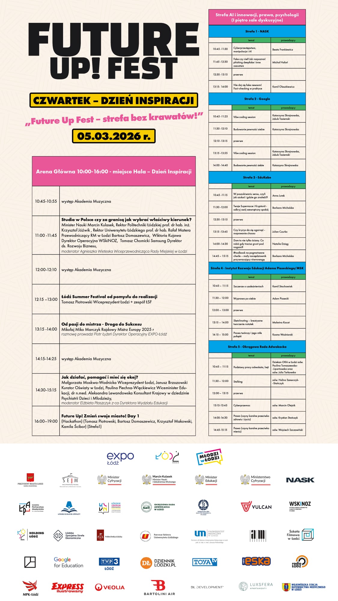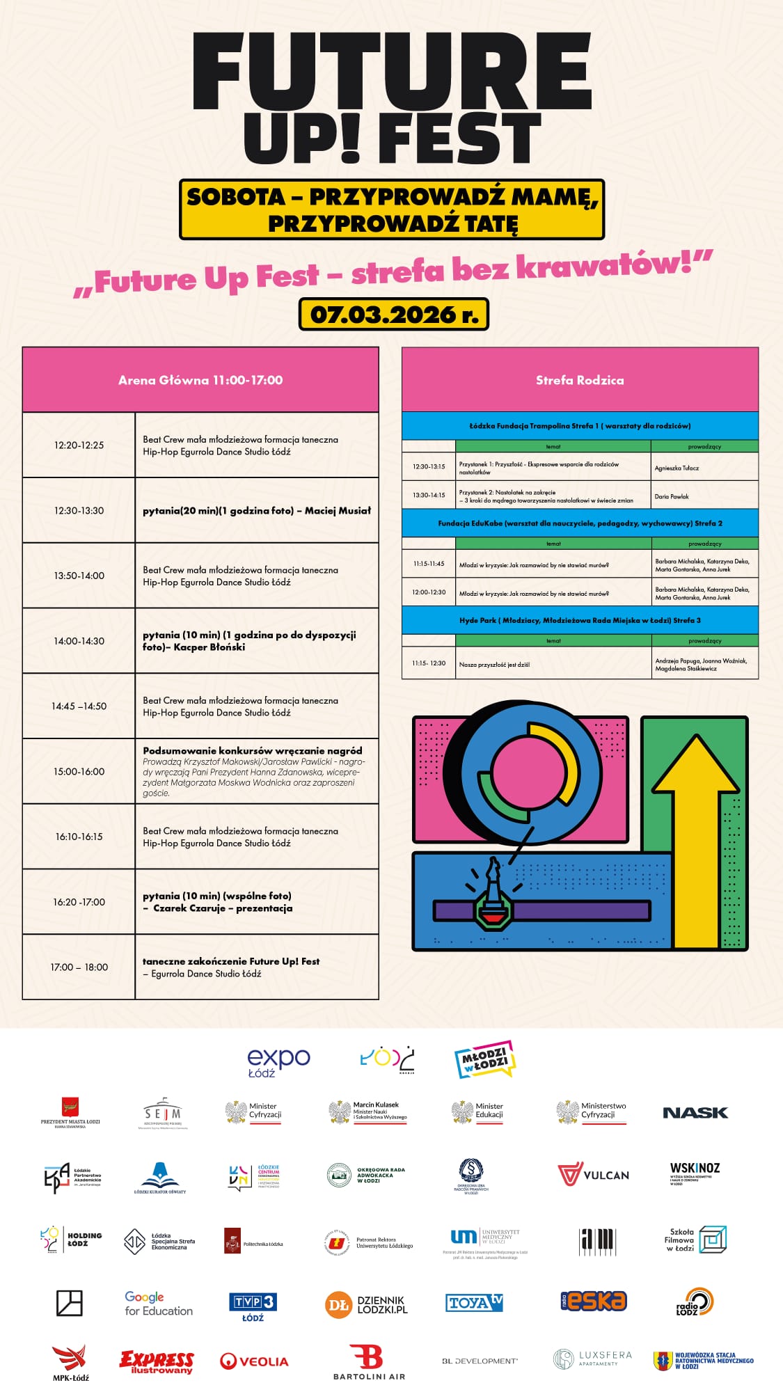 Przypominamy o wydarzeniu Future Up! Fest, które odbędzie się w dniach 5 – 7 marca 2026 r. w hali EXPO. Szczególną uwagę zawracamy na dzień 7 marca, którego program jest skierowany do rodziców, stąd jego nazwa - „Przyprowadź Mamę, przyprowadź Tatę”.